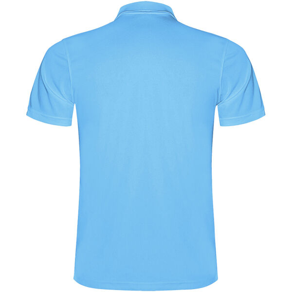Kurzärmeliges Funktions-Poloshirt. Gestrickter Kragen mit 3-Knopfleiste. Atmungsaktives, leicht zu waschendes und zu trocknendes Material. Herausnehmbares Etikett. Technisches Gewebe. Atmungsaktiver Stoff. Das Modell ist 184 cm groß und trägt Größe L.